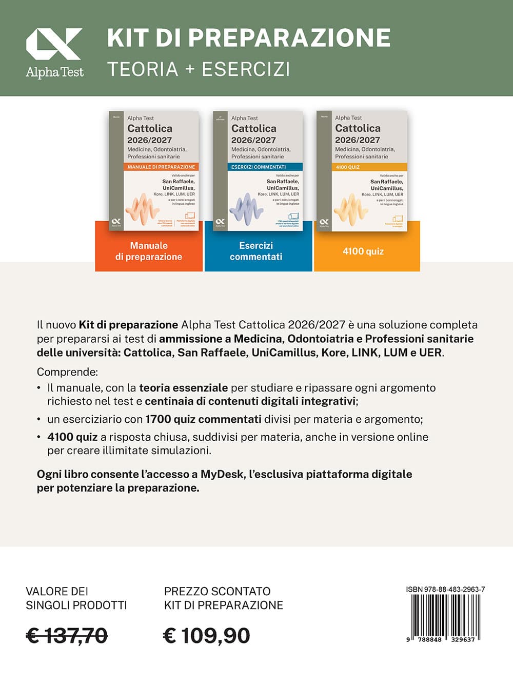 Questo kit è una soluzione completa per prepararti al test per i corsi di area medico-sanitaria delle università Cattolica, San Raffaele, UniCamillus, Kore, LINK, LUM, UER (compresi i corsi erogati in lingua inglese).