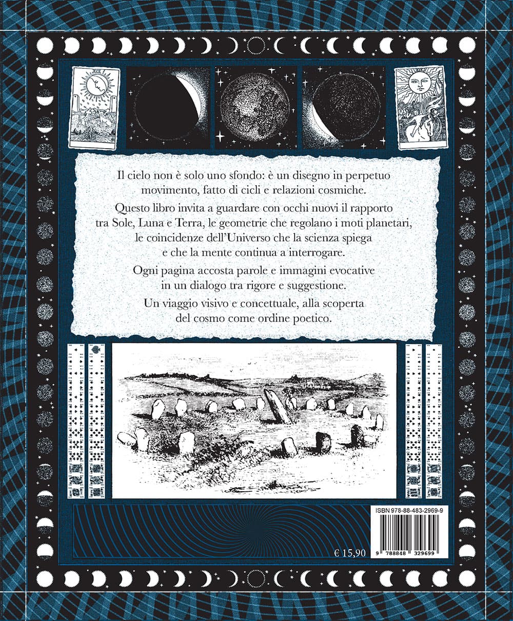 Il cielo non è solo uno sfondo: è un disegno in movimento, fatto di cicli, eclissi, proporzioni. Questo libro invita a guardare con occhi nuovi il rapporto tra Sole, Luna e Terra, le geometrie che regolano i moti planetari, le coincidenze che la scienza spiega e la mente continua a interrogare.